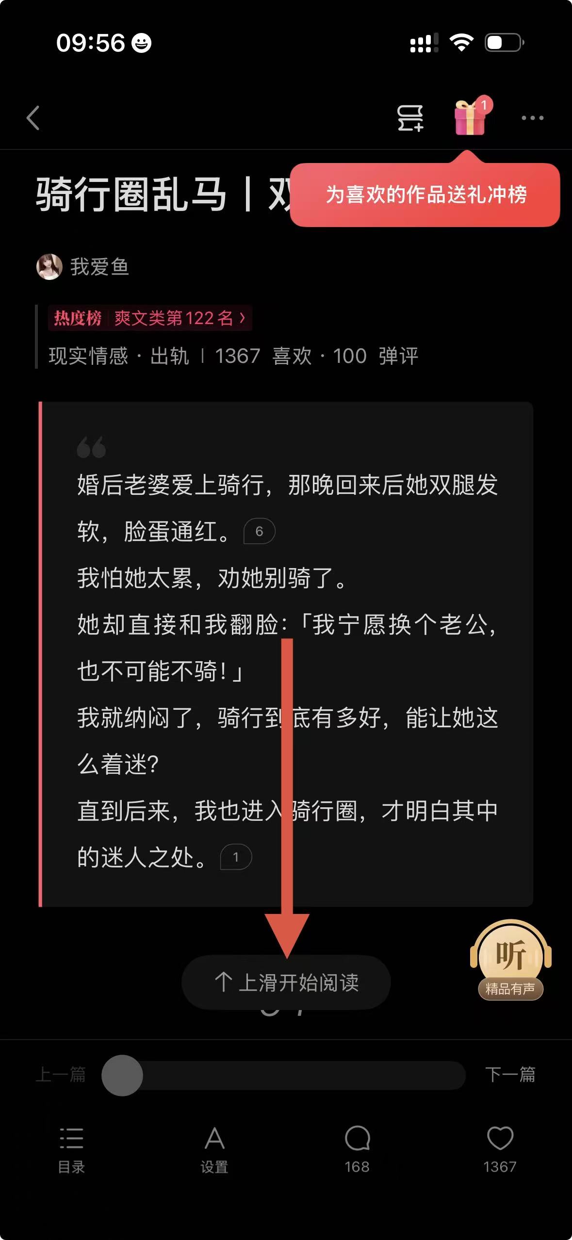 2、在小說(shuō)閱讀界面,上滑開(kāi)始閱讀,進(jìn)入小說(shuō)內(nèi)容頁(yè)面。