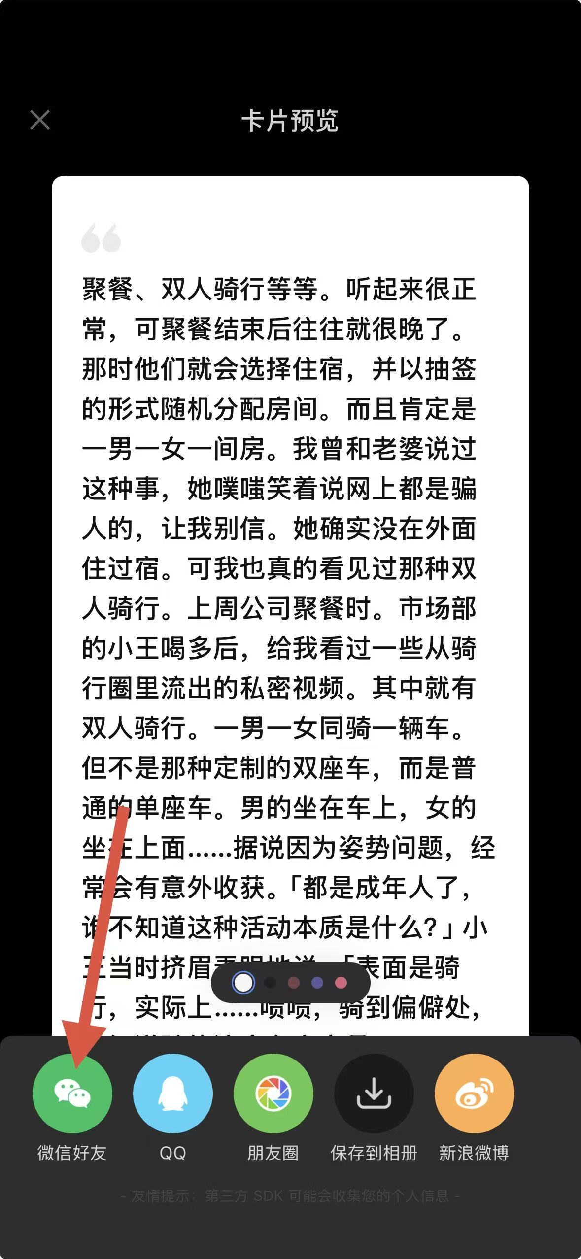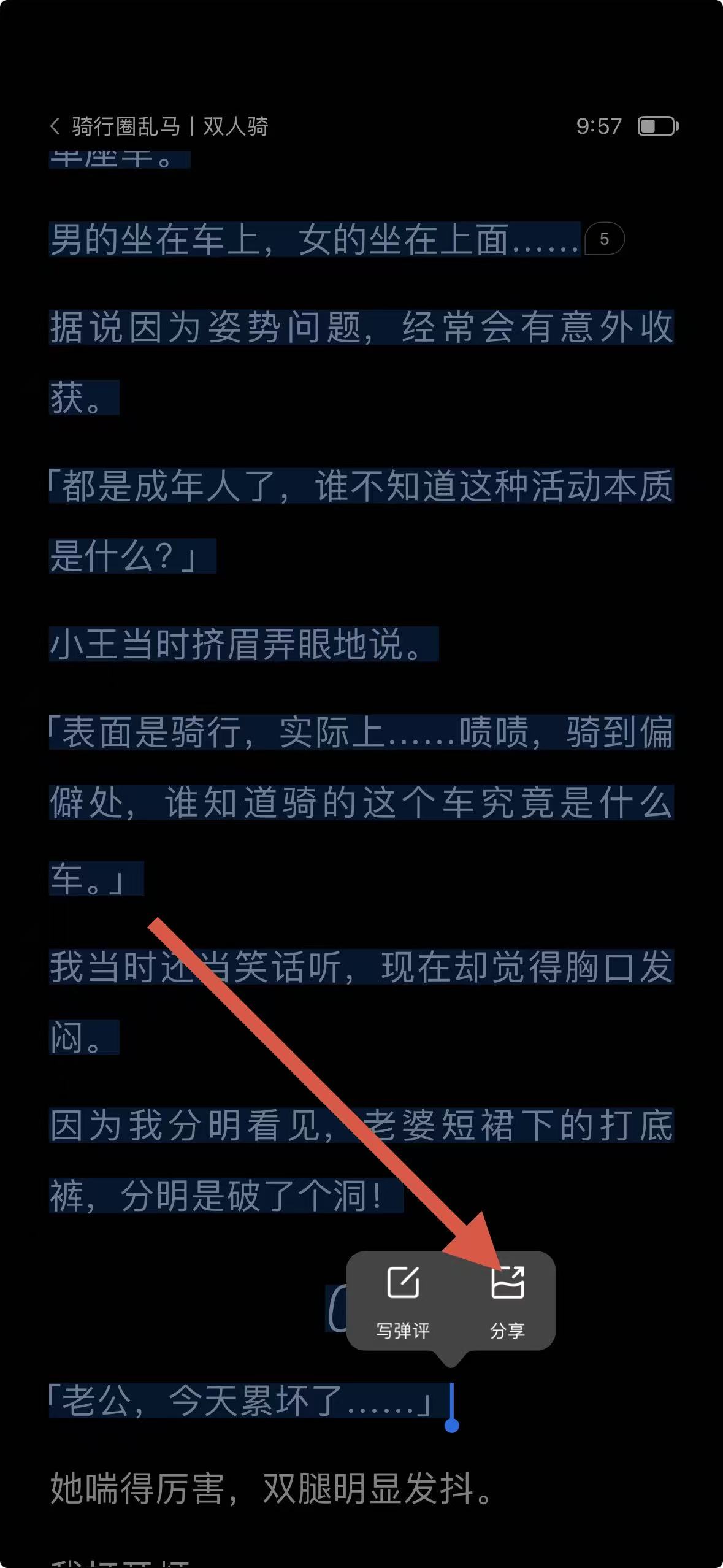 3、在小說(shuō)內(nèi)容頁(yè)面,點(diǎn)擊長(zhǎng)按全選復(fù)制文字內(nèi)容,點(diǎn)擊分享選項(xiàng),進(jìn)入分享界面。