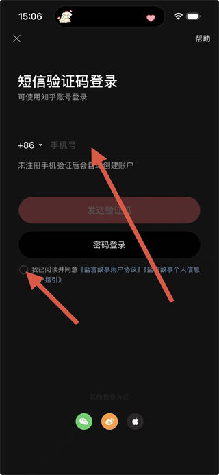 3、在登錄頁(yè)面,選擇短信驗(yàn)證碼登錄方式,輸入手機(jī)號(hào)并勾選同意協(xié)議。