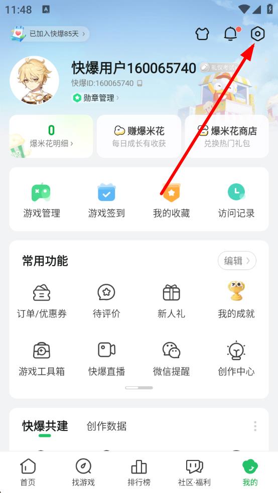 1、打開好游快爆APP,點擊底部導(dǎo)航欄的我的進(jìn)入個人中心,再點擊右上角設(shè)置圖標(biāo),進(jìn)入設(shè)置頁面。