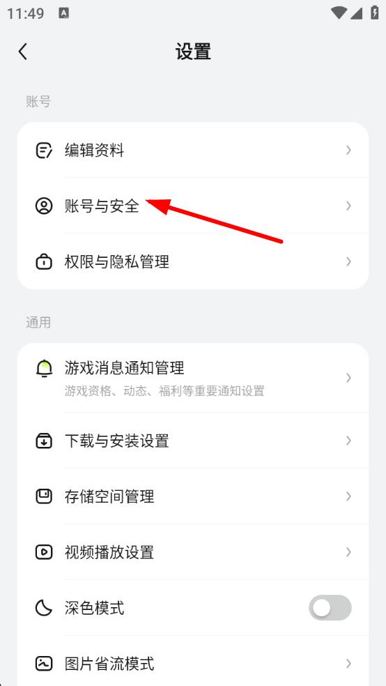 2、在設(shè)置頁面中,找到并點擊賬號與安全選項,進(jìn)入賬號與安全相關(guān)設(shè)置界面。