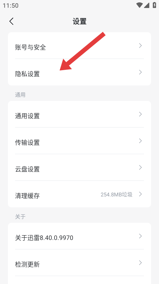 1、打開迅雷APP,進(jìn)入賬號(hào)設(shè)置的頁面,點(diǎn)擊隱私設(shè)置的選項(xiàng),進(jìn)入隱私設(shè)置界面。