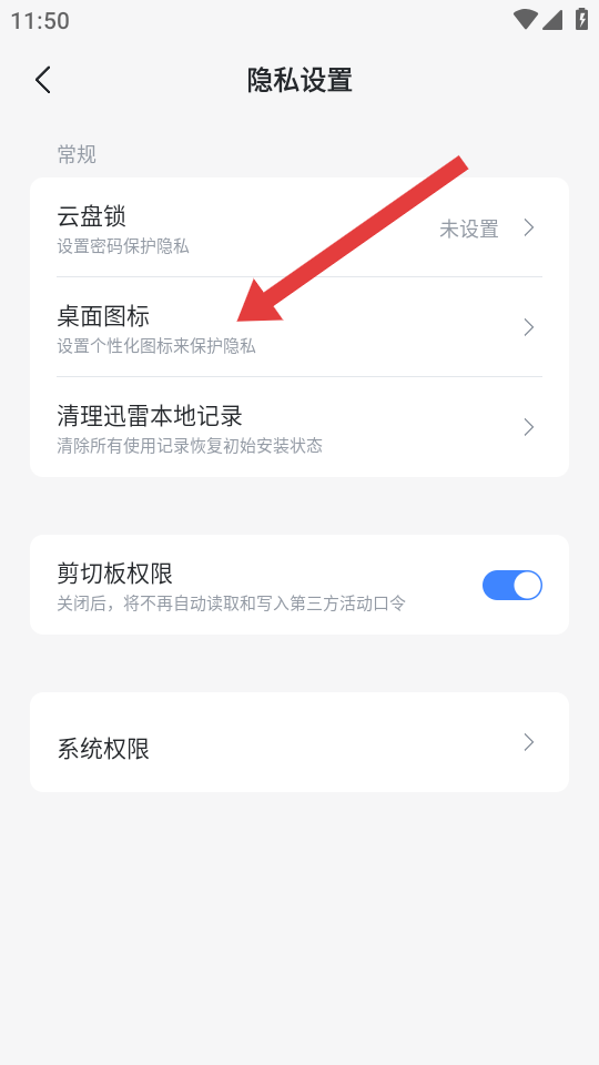 2、在隱私設(shè)置的頁面中,需要點(diǎn)擊桌面圖標(biāo)的選項(xiàng),跳轉(zhuǎn)至更換圖標(biāo)的頁面。