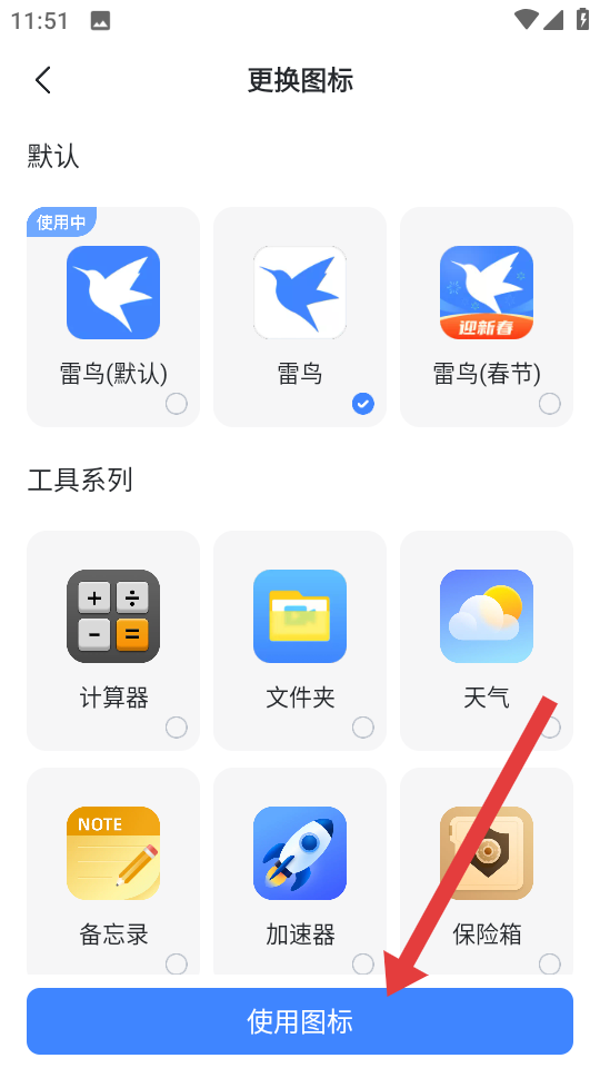 3、在更換圖標(biāo)頁面,選擇喜歡的圖標(biāo)樣式如雷鳥、計(jì)算器、文件夾等,點(diǎn)擊底部使用圖標(biāo)按鈕,就已經(jīng)成功修改了桌面圖標(biāo)。