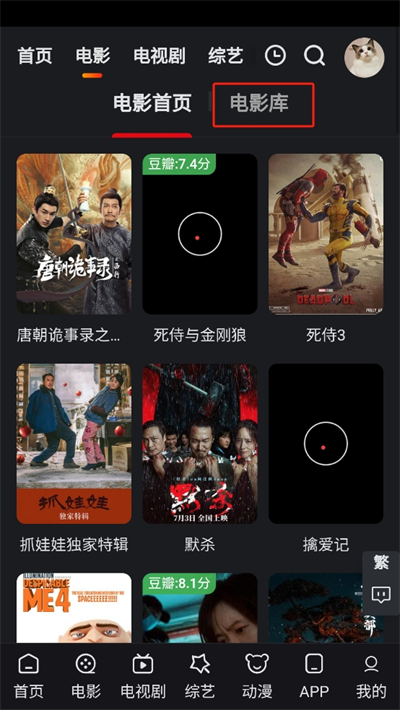 2、進(jìn)入電影欄目后可以看到近期比較熱門的影視作品,為了方便進(jìn)行條件篩選查找,我們選擇電影庫;