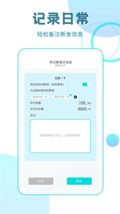 2、斷食時間記錄,記錄每一次的飲食時間,斷食達到計劃時間后,可以自動提醒飲食時間;
