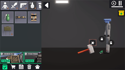2、玩家可以任意選擇一個(gè)感興趣的模式進(jìn)入,在該模式中,大家可以自由的根據(jù)自己的想法添加人物和設(shè)置各種障礙物,游戲操作簡(jiǎn)單,直接將自己需要的物品點(diǎn)擊拖動(dòng)并對(duì)其進(jìn)行攻擊即可;