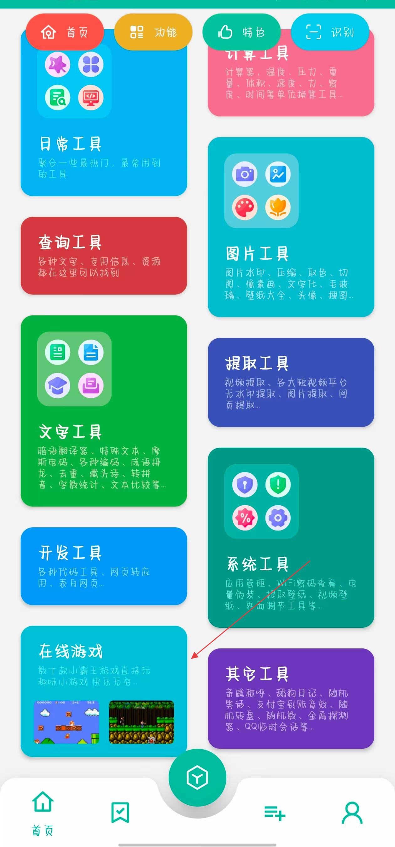 1、打開宇宙工具箱應(yīng)用,在功能分類頁面里,找到并點擊在線游戲板塊,進(jìn)入在線游戲列表界面。