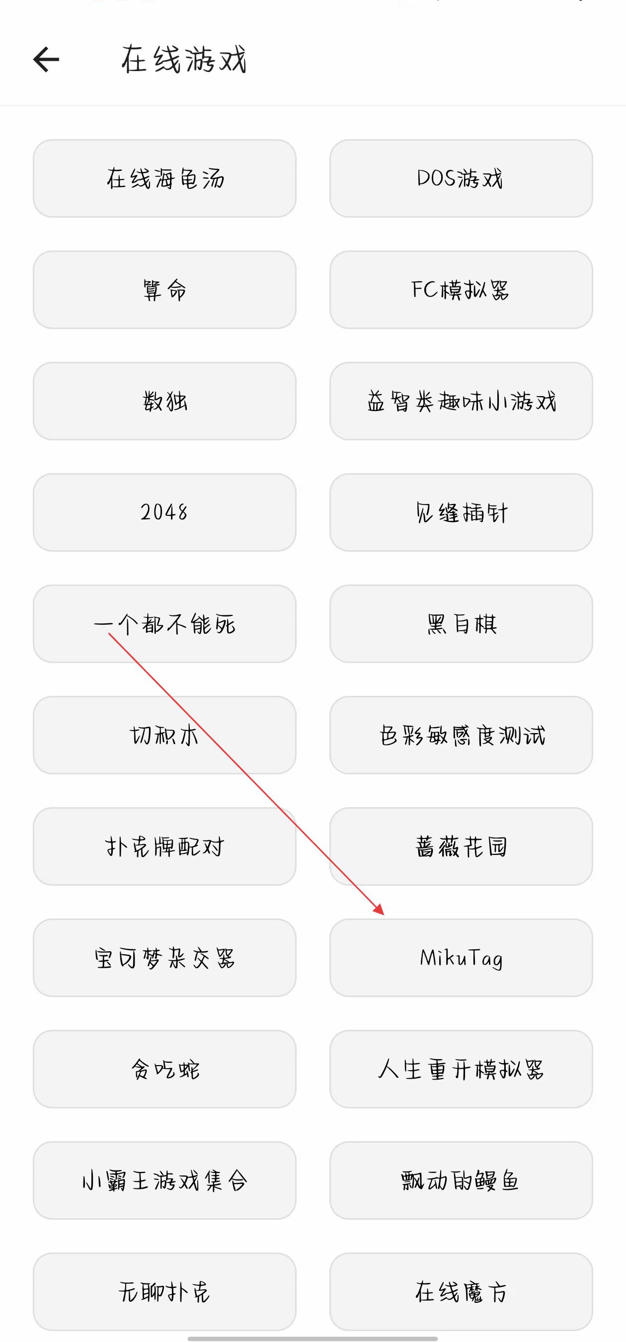 2、在在線游戲列表中,選擇想玩的游戲,比如MikuTag,點擊游戲名稱進(jìn)入游戲頁面。
