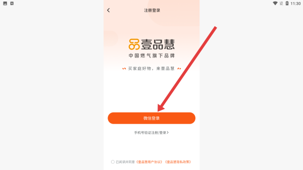 3、在注冊(cè)登錄頁(yè)面勾選協(xié)議后,點(diǎn)擊微信登錄按鈕,完成壹品慧賬號(hào)登錄。