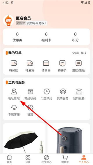 2、在個(gè)人頁(yè)面中,點(diǎn)擊地址管理選項(xiàng)。