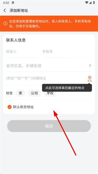 4、在添加新地址頁(yè)面,填寫聯(lián)系人信息、地址等內(nèi)容后點(diǎn)擊保存即可添加新地址信息。