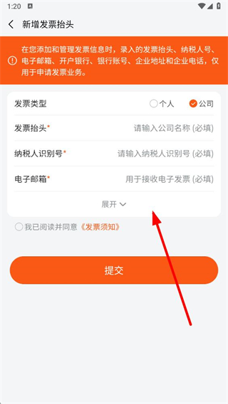 4、在新增發(fā)票抬頭界面,選擇發(fā)票類型,填寫對(duì)應(yīng)信息,勾選協(xié)議后點(diǎn)擊提交完成設(shè)置。