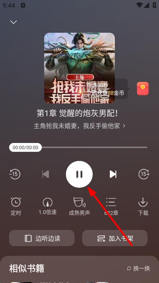 4、在聽書界面,點(diǎn)擊播放按鈕,即可開始收聽該小說。