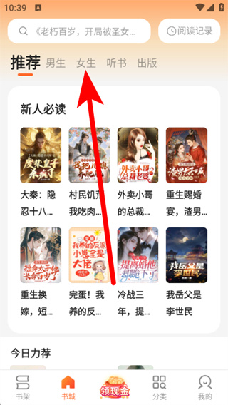 1、在盛讀小說書城頁面,點(diǎn)擊女生選項(xiàng),進(jìn)入女生小說列表頁面。