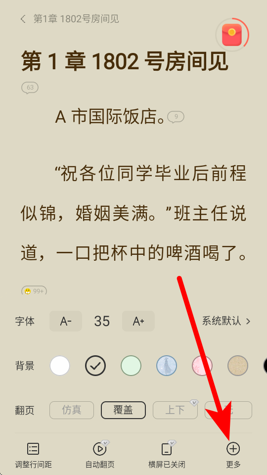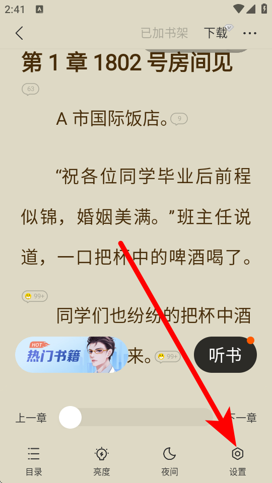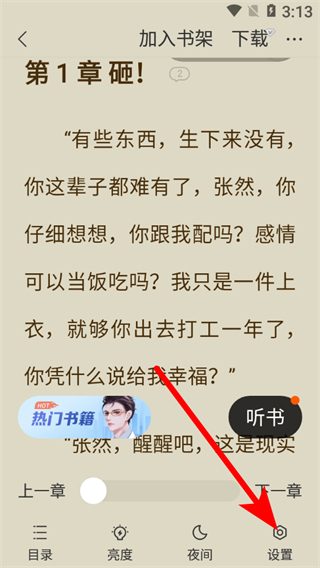 2、在閱讀界面中,點(diǎn)擊屏幕調(diào)出底部菜單,然后點(diǎn)擊右下角設(shè)置選項。
