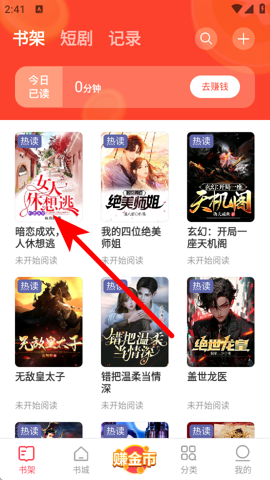 1、在速讀免費(fèi)閱讀小說書架頁面,點(diǎn)擊要閱讀的書籍封面,進(jìn)入閱讀界面。