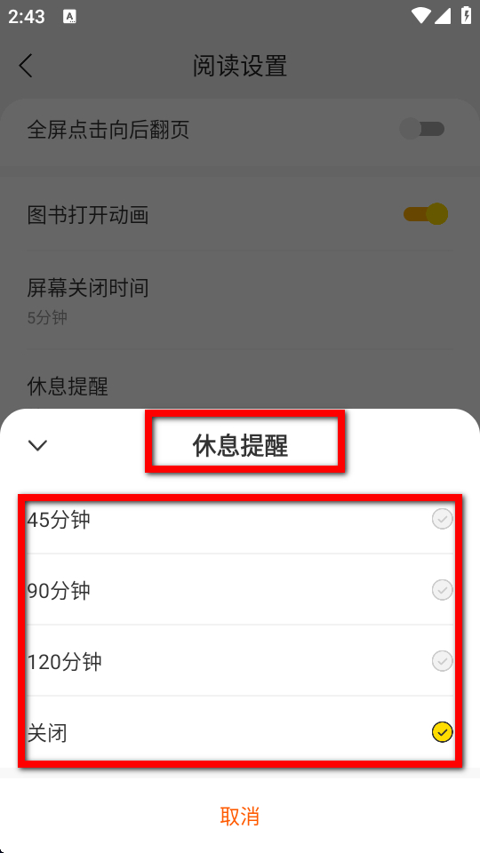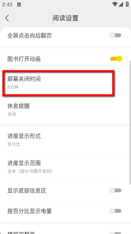 4、在閱讀設(shè)置頁面,找到屏幕關(guān)閉時間選項,可設(shè)置屏幕關(guān)閉的時長。