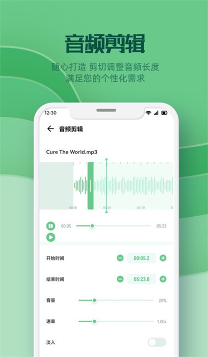 3、簡單免費(fèi)剪輯,可以裁剪音頻、調(diào)整音量、添加混響、漸入漸出等操作。