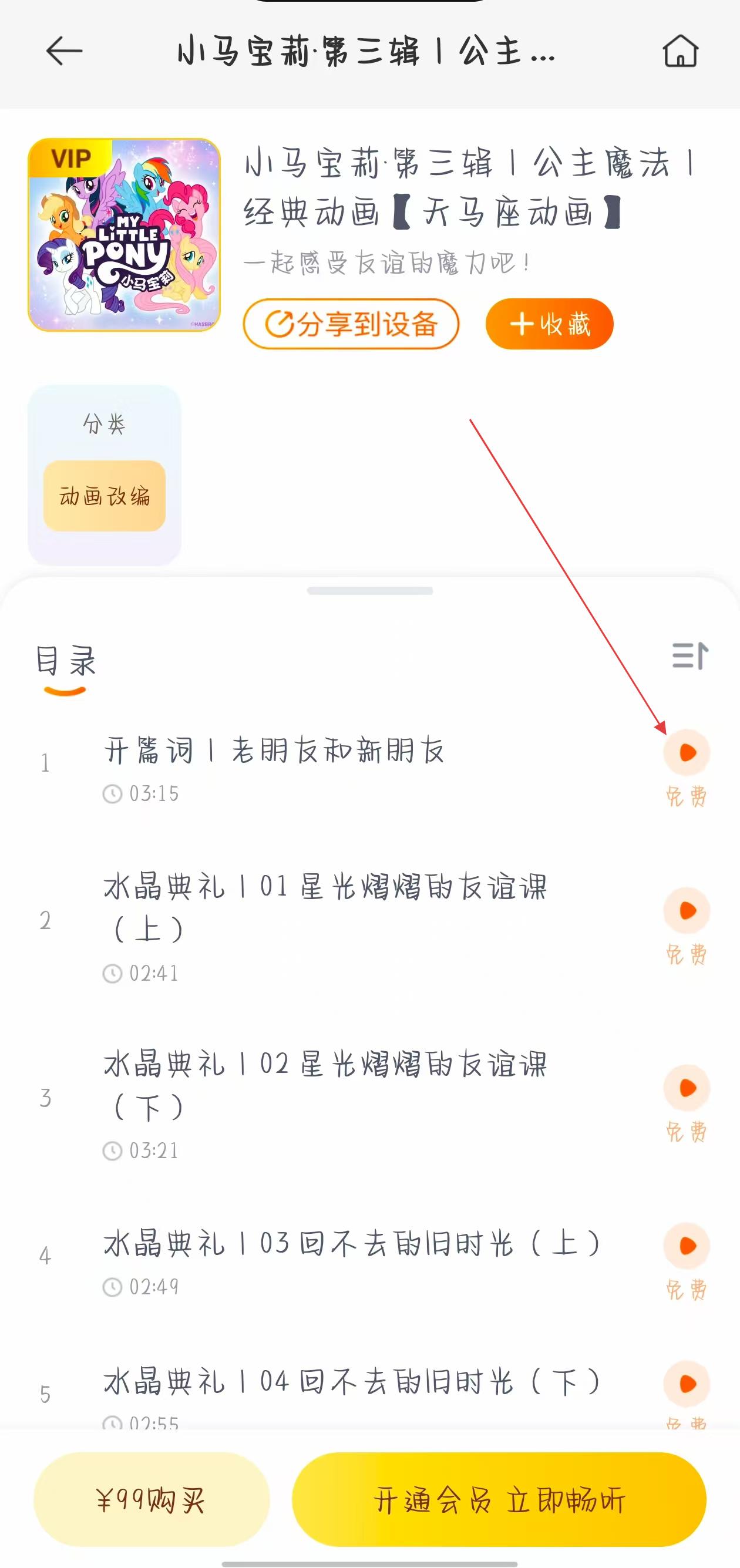 4、在故事專(zhuān)輯詳情頁(yè)面,找到具體的故事章節(jié),點(diǎn)擊章節(jié)右側(cè)的播放按鈕,即可開(kāi)始收聽(tīng)故事。