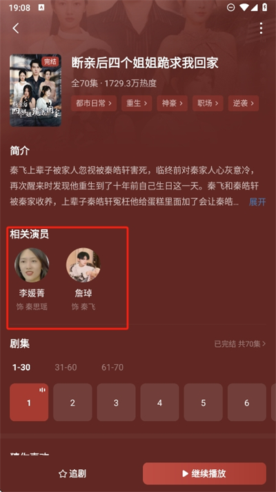 4、進(jìn)入后就可以看到相關(guān)的演員信息,不僅能夠看到演員的飾演者還能看到短劇中飾演的誰(shuí)。