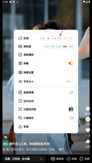 4、在播放頁(yè)面彈出菜單欄時(shí),點(diǎn)擊要倍速的速度即可。