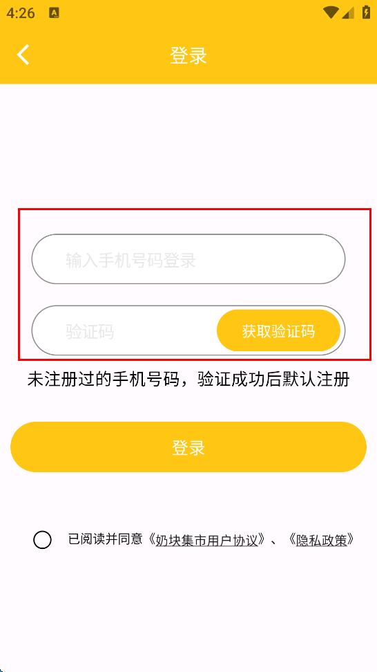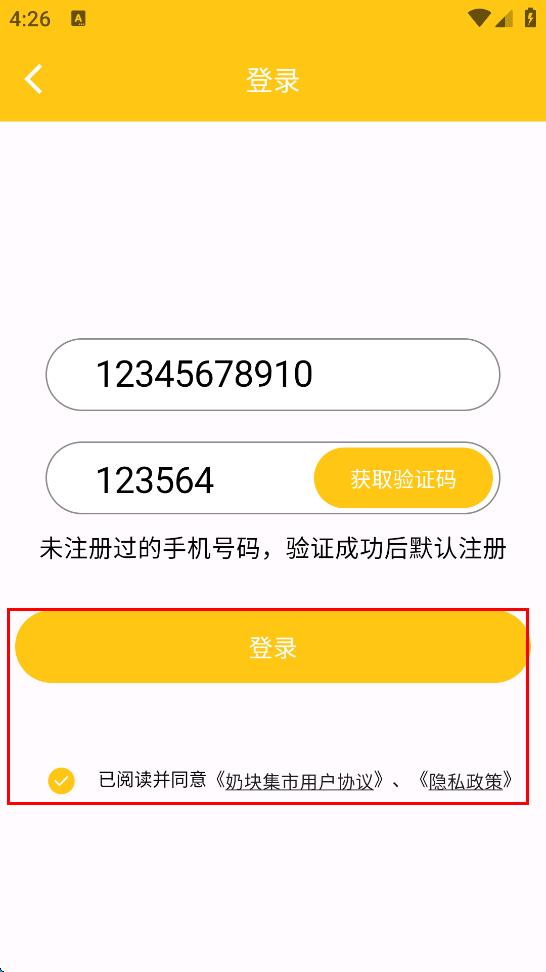 4、勾選“已閱讀并同意奶塊集市用戶協(xié)議,隱私政策,點(diǎn)擊“登錄”按鈕,完成登錄操作。