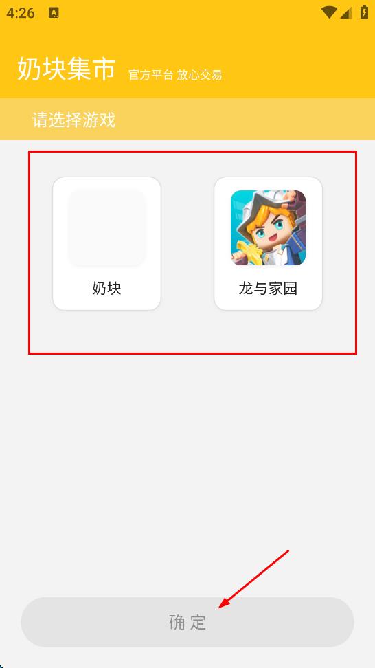 1、打開(kāi)奶塊集市APP,選擇要交易的游戲,點(diǎn)擊“確定”,進(jìn)入集市頁(yè)面。
