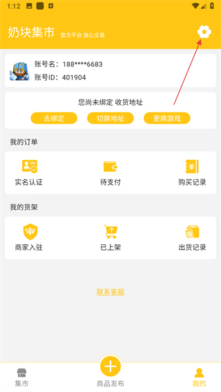 1、打開(kāi)奶塊集市APP,進(jìn)入個(gè)人中心,點(diǎn)擊設(shè)置圖標(biāo)。