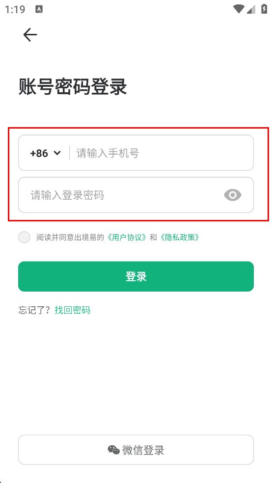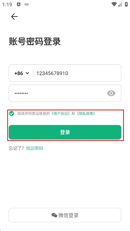 4、勾選閱讀并同意出境易的用戶協(xié)議和隱私政策,點擊“登錄”按鈕,完成登錄操作。