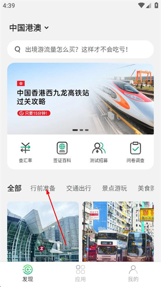 2、在發(fā)現(xiàn)界面點擊行前準備分類,進入行前準備內(nèi)容界面。