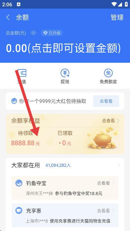 2、進(jìn)入模擬的錢包界面后,找到顯示余額的位置,點(diǎn)擊金額顯示區(qū)域。