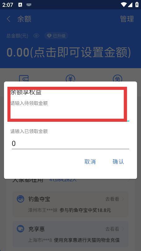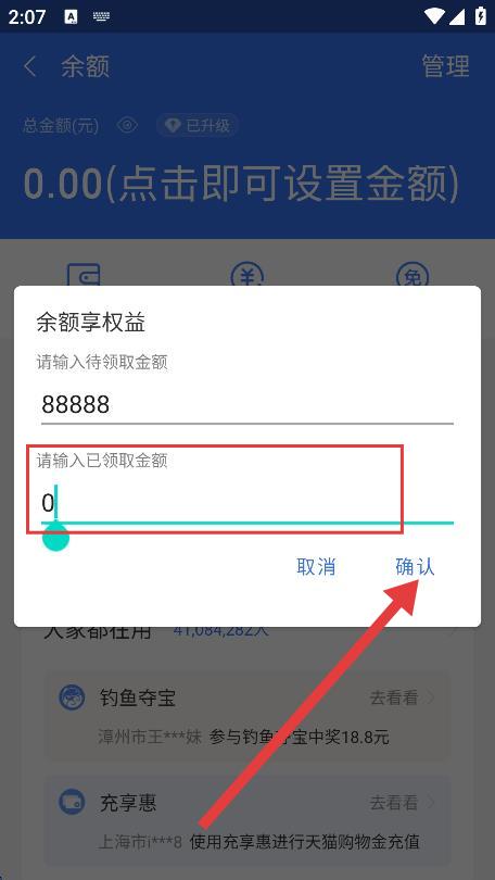 4、在待領(lǐng)取輸入框內(nèi)輸入金額,點(diǎn)擊確認(rèn)按鈕,即可完成錢包余額設(shè)置。