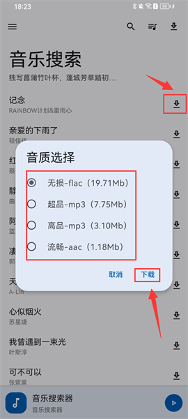 2、點擊歌名右邊的下載按鍵,就會出現一個彈窗,有無損/超品/高品/流暢四種音質選擇,確認好音質后,點擊下載即可;
