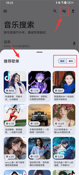 3、點擊右上方的第二個按鍵,底部就會彈出歌單推薦,氛圍最新和最熱歌單,都有各種不同類型的歌曲,用戶可以根據需求選擇;