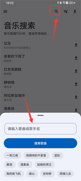 4、點擊上方的搜索按鍵,下方也會出現一個彈窗,可以直接輸入歌手名字或者是歌曲名稱即可快速搜索到想要的結果。