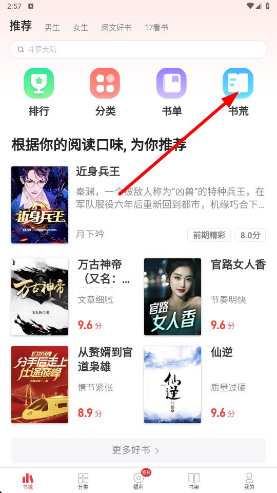 1、打開追書神器APP,進(jìn)入主界面中的書城頁面,點擊上方導(dǎo)航欄里的書荒選項。