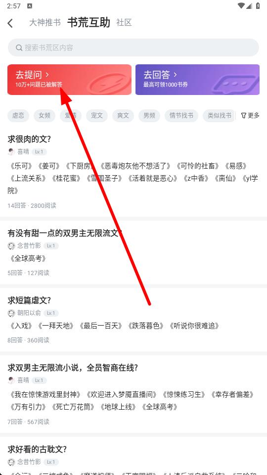 3、在書荒互助界面,點擊去提問按鈕,若處于游客狀態(tài),系統(tǒng)會提示登錄,按提示完成登錄后,即可進(jìn)行提問,尋求書荒相關(guān)問題的解答。