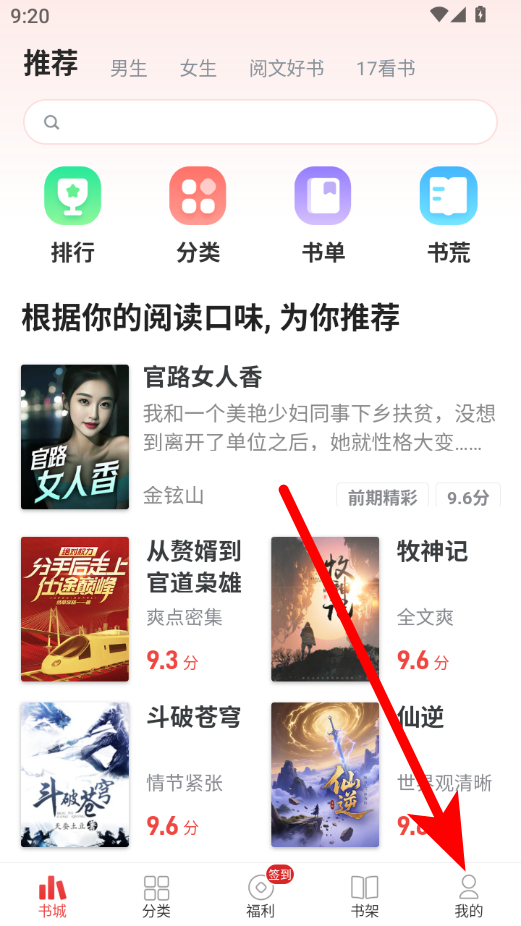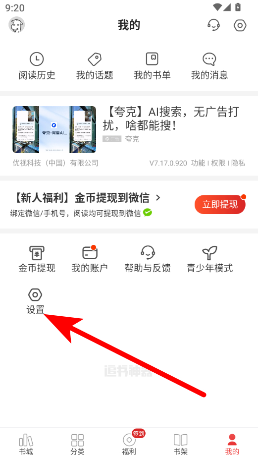 1、在追書神器主界面,點擊右下角我的選項,進(jìn)入個人中心界面。