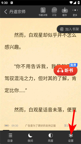 2、在書籍閱讀界面,點擊右下角設(shè)置選項,展開設(shè)置菜單。