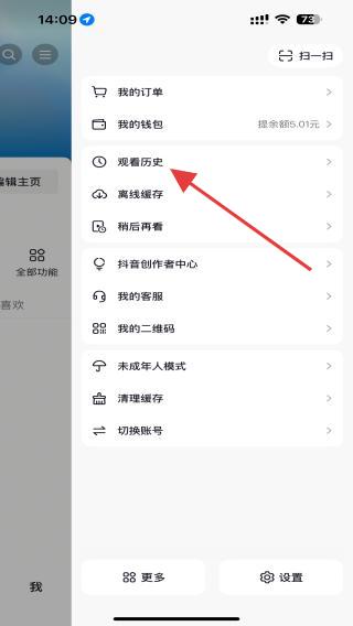 3、在右側(cè)彈出的菜單欄中,找到觀看歷史的功能按鈕。