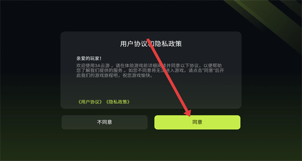 1、點(diǎn)擊“用戶協(xié)議和隱私政策”彈窗的“同意”,進(jìn)入3A云游主界面。