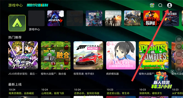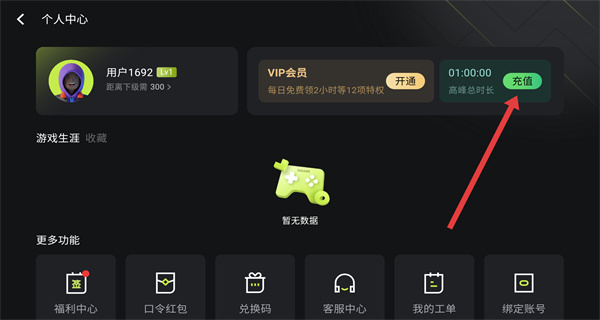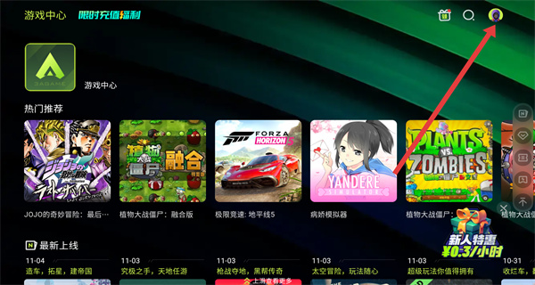 1、在游戲平臺(tái)首頁(yè)點(diǎn)擊右上角頭像,進(jìn)入個(gè)人中心頁(yè)面。
