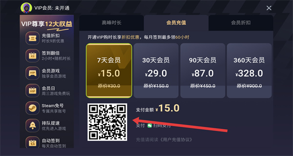 4、使用微信掃碼支付15元,即可完成7天會(huì)員的充值操作。