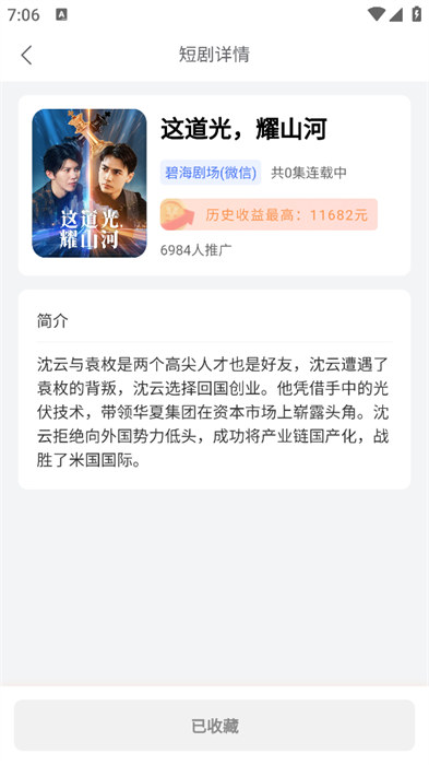 2、點(diǎn)擊自己想要觀看的短劇資源內(nèi)容就能看到短劇詳細(xì)的簡介和推廣人數(shù)等;