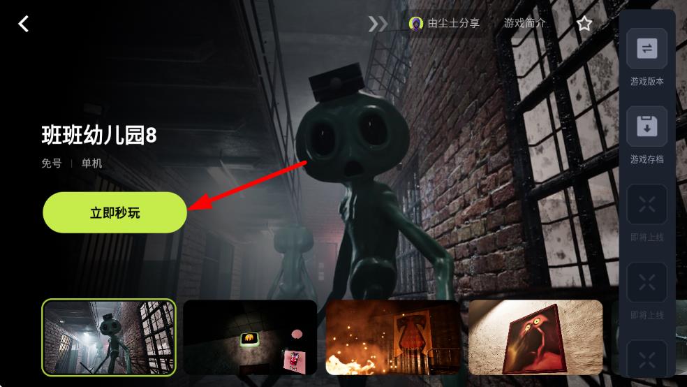 1、打開3a云游戲應(yīng)用,找到想玩的游戲,比如班班幼兒園8,點(diǎn)擊游戲界面中的立即秒玩按鈕。