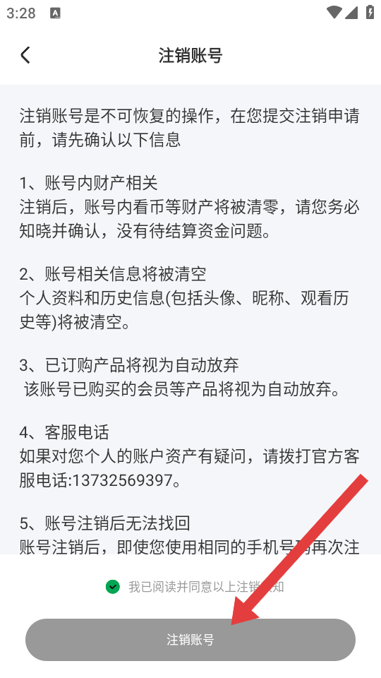 4、在注銷賬號頁面,勾選注銷須知,然后點擊底部的注銷賬號按鈕,完成賬號注銷。