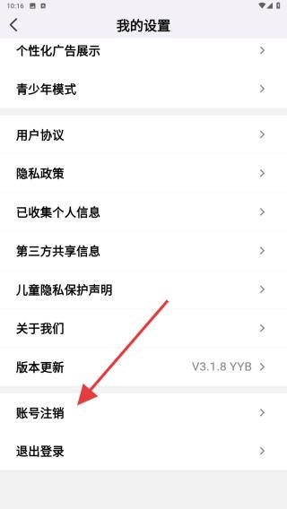 3、在我的設(shè)置界面內(nèi),向下滑動找到并點(diǎn)擊賬號注銷的功能按鈕。