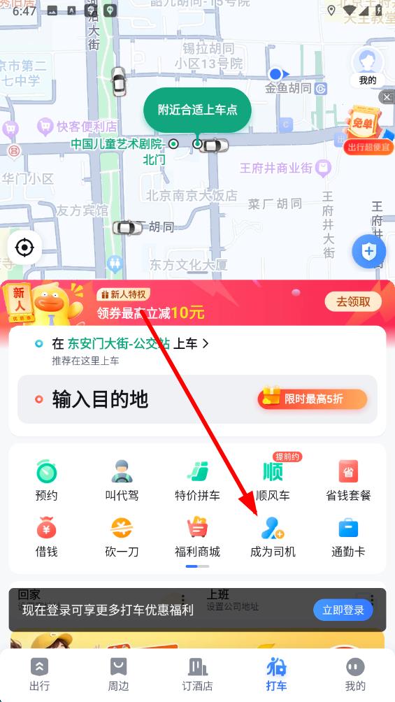 2、在打車界面里,找到并點(diǎn)擊成為司機(jī)的按鈕,進(jìn)入司機(jī)注冊(cè)相關(guān)頁(yè)面。