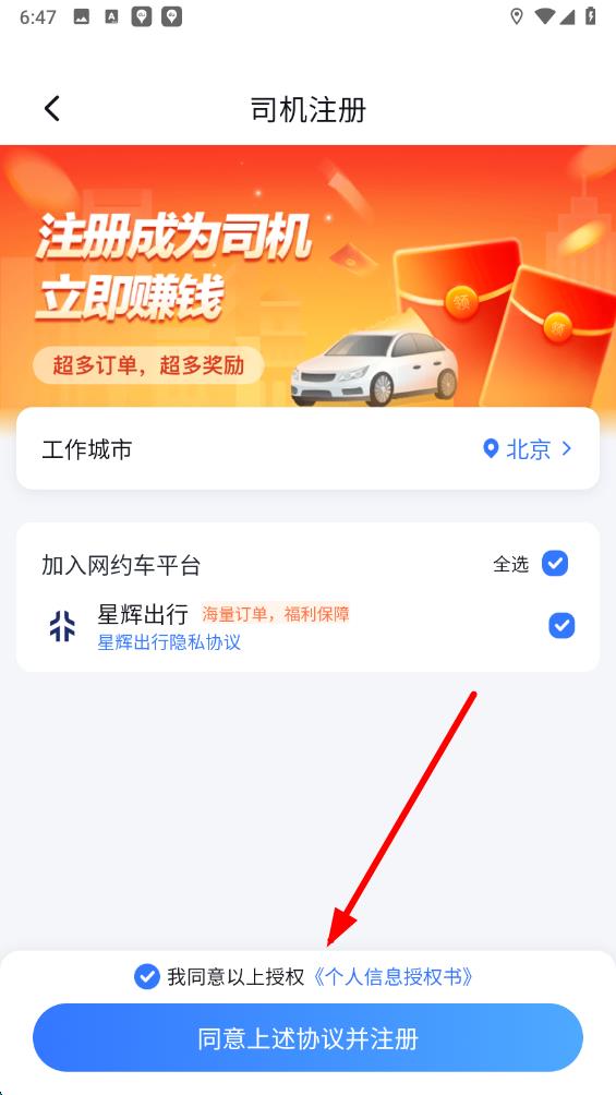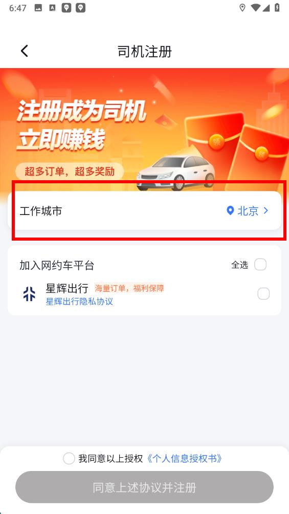 4、選擇想要加入的網(wǎng)約車平臺(tái),勾選平臺(tái)對(duì)應(yīng)的隱私協(xié)議,最后點(diǎn)擊同意上述協(xié)議并注冊(cè),按后續(xù)提示完成注冊(cè)流程即可接單。
